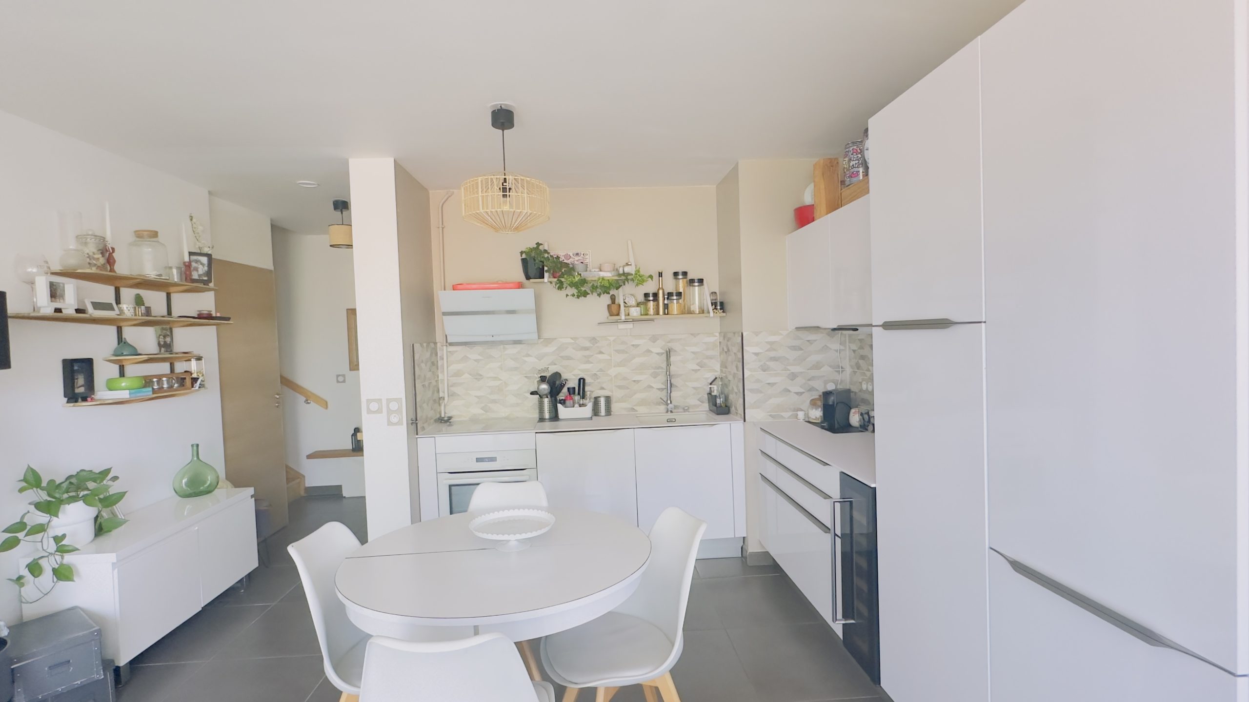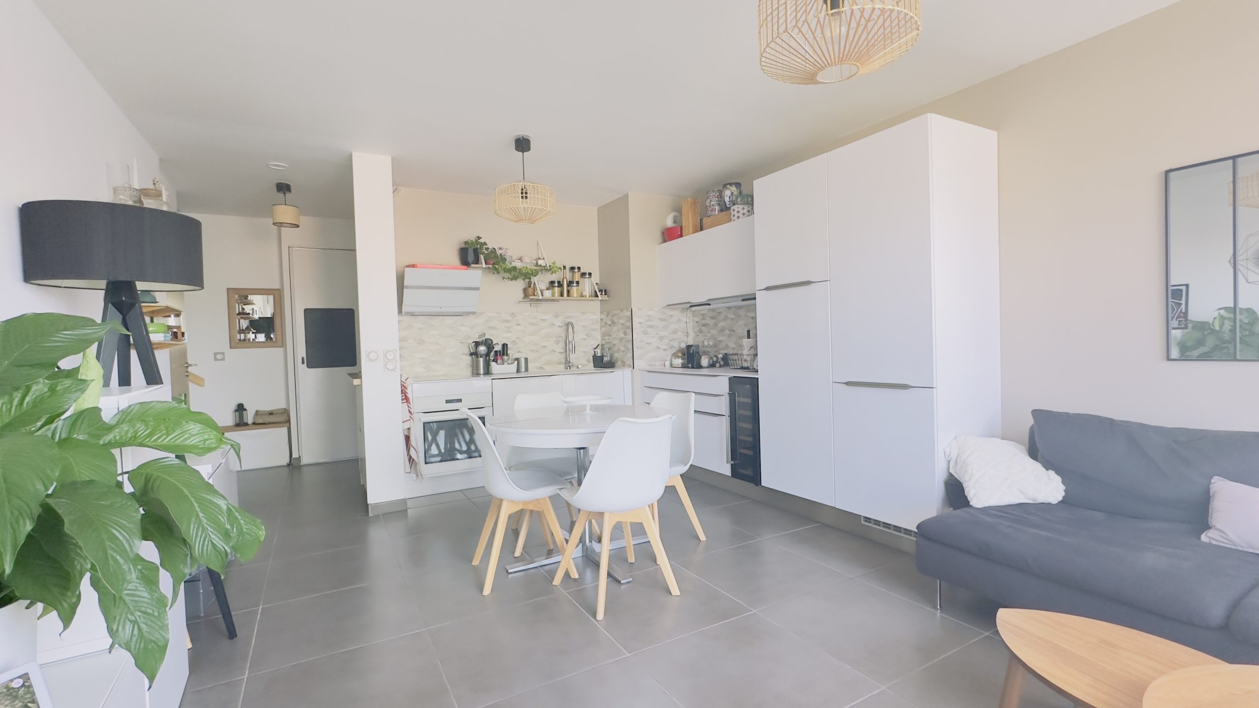L'appartement comprend au rez-de-chaussée un salon/salle à manger avec une jolie cuisine ouverte donnant accès à une terrasse agréable sans vis-à-vis avec une vue dégagée sur le Pic St Loup, une chambre avec un accès sur la terrasse et une salle d'eau avec WC.