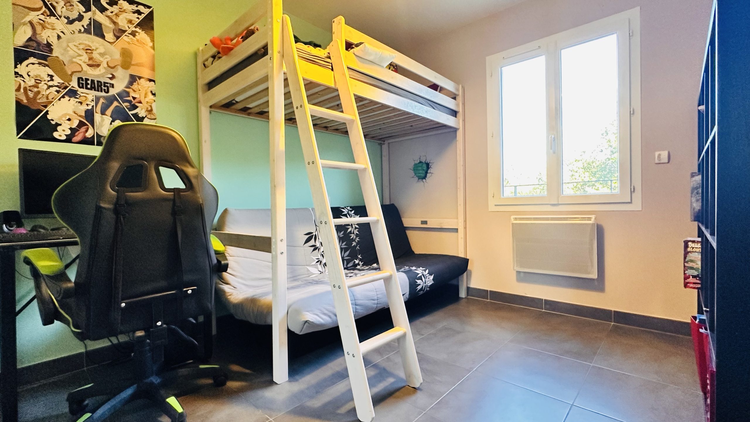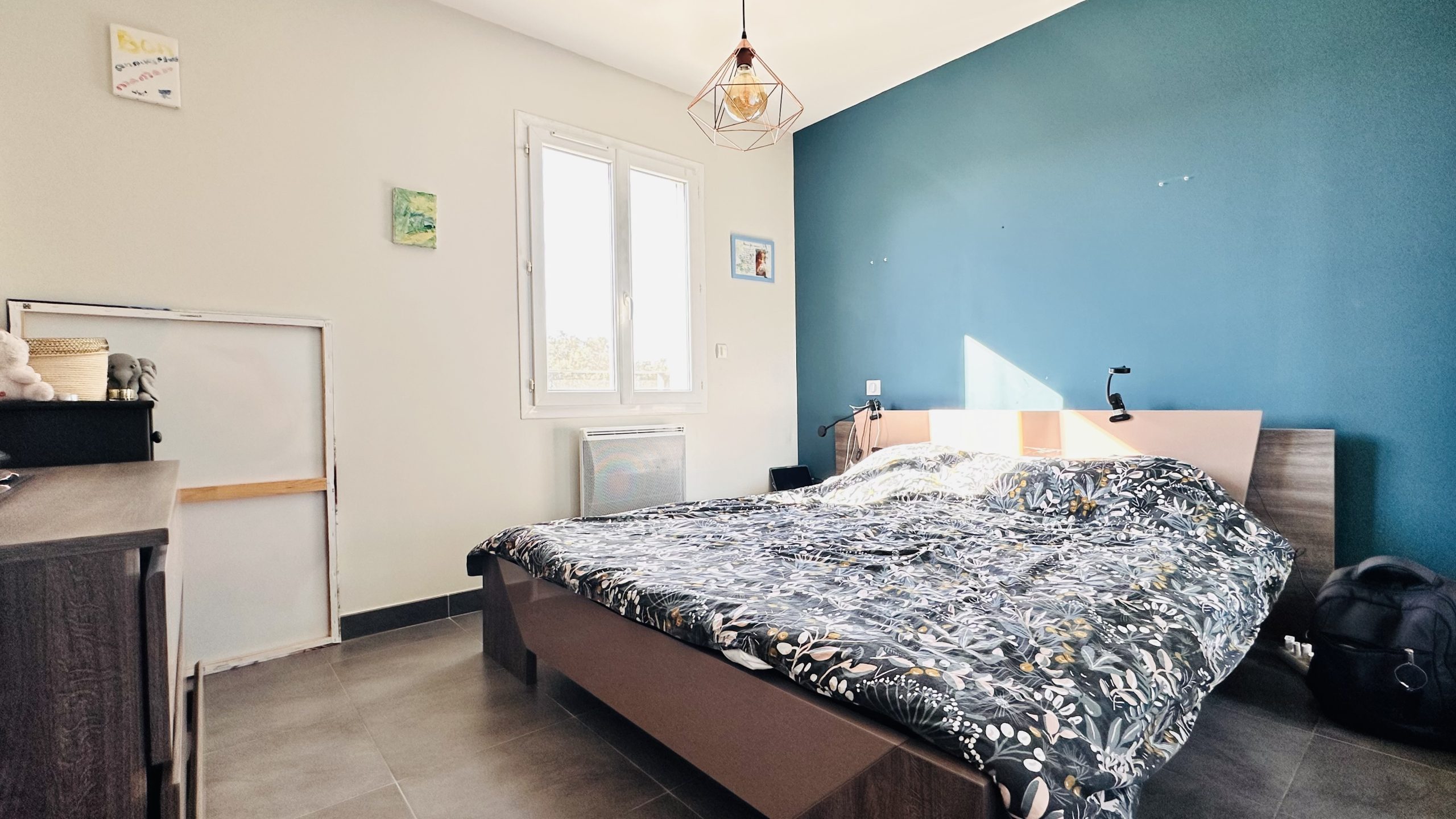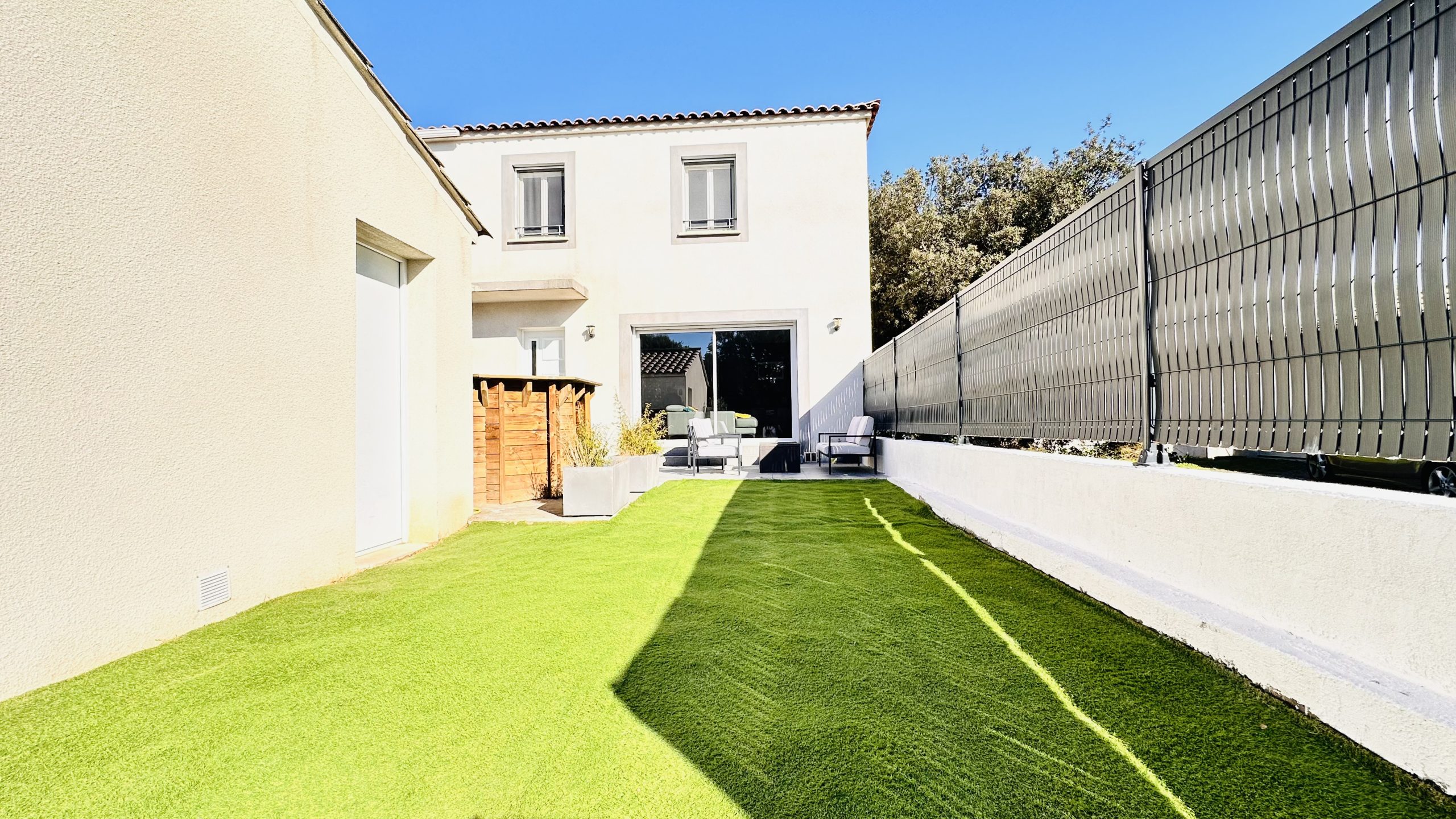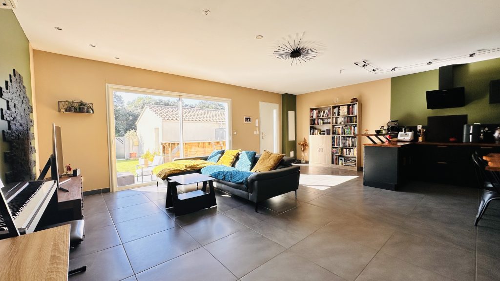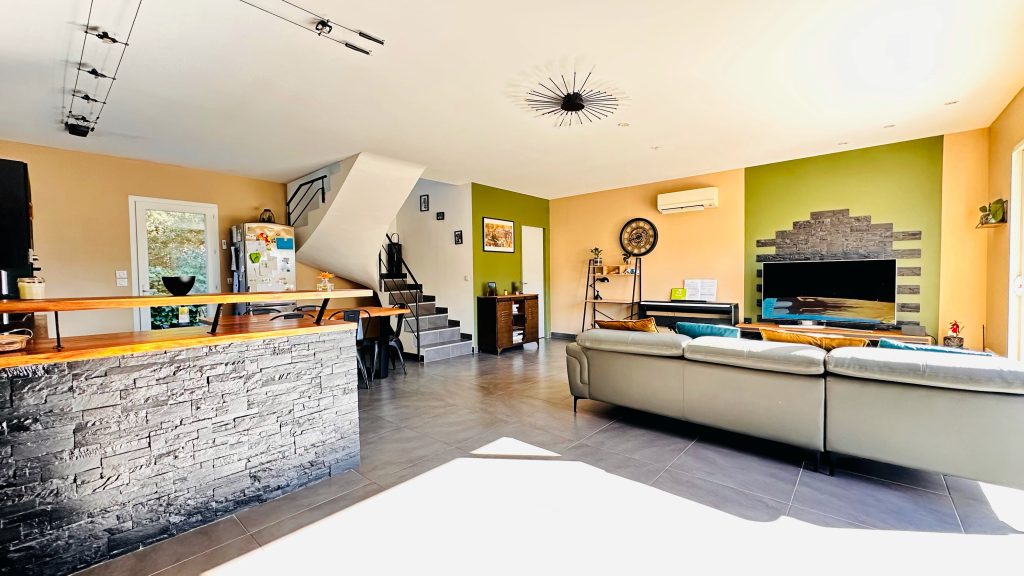 Au rez-de-chaussée se trouve une pièce à vivre spacieuse avec une cuisine ouverte et un WC séparé. L'étage se compose de 3 chambres avec pour chacune un placard de rangement, une salle de bain avec baignoire et douche et un WC séparé. Côté équipement, la maison dispose de la climatisation réversible et de menuiseries en aluminium double vitrage